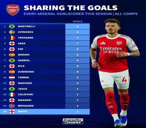 据统计,本赛季阿森纳已有16人收获进球,其中马丁内利以9球领跑,约克雷斯贡献8球,特罗萨德和各入7球,与梅里诺各有5球入账,、赖斯、苏维门迪均收获4球,和各进3球,、、恩瓦内里、以及本·怀特则各有1球进账。